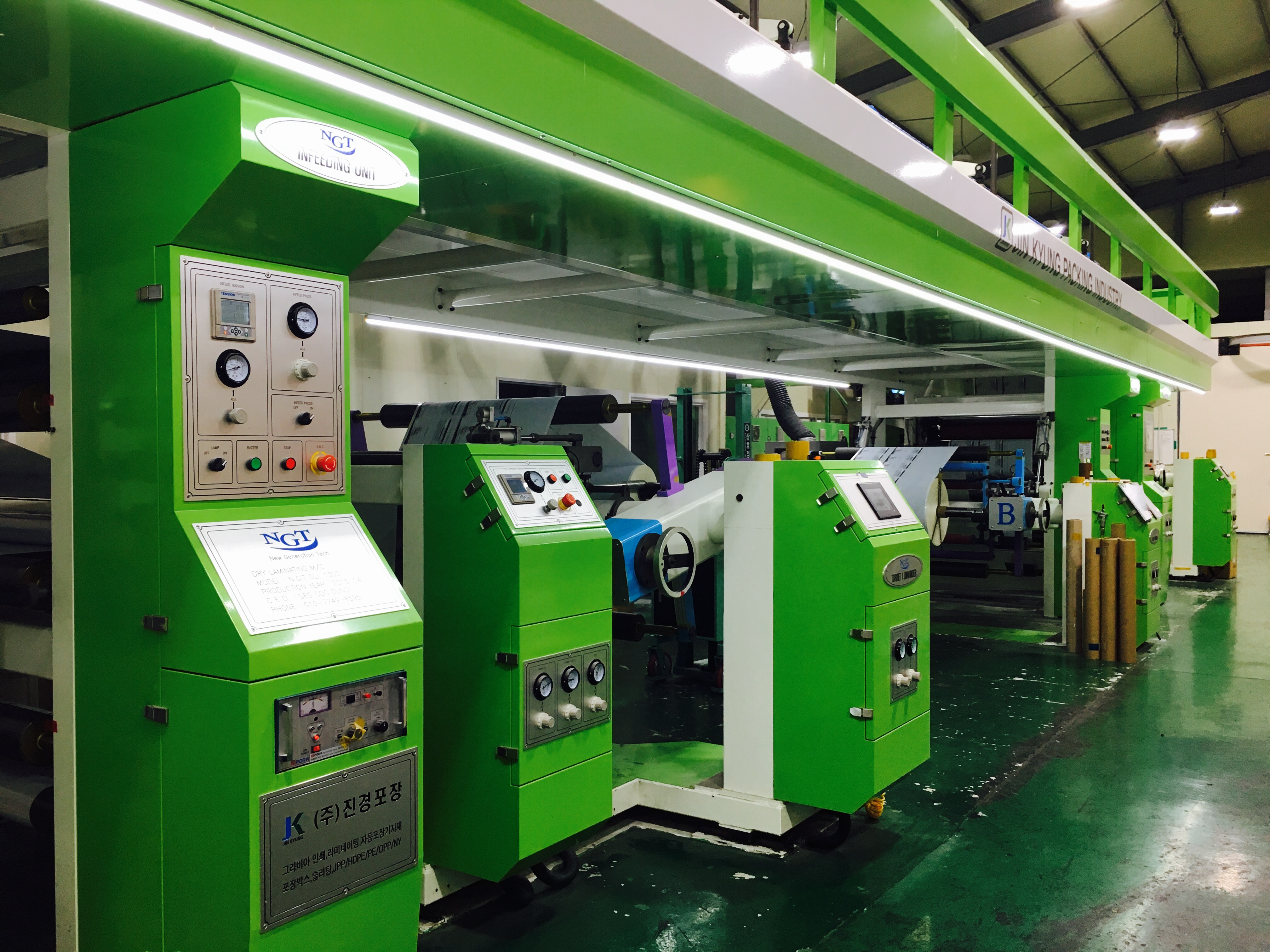 Dry laminating is the process of bonding the printed film and the inner coated film using adhesive and heat. It is characterized by good transparency and adhesion.